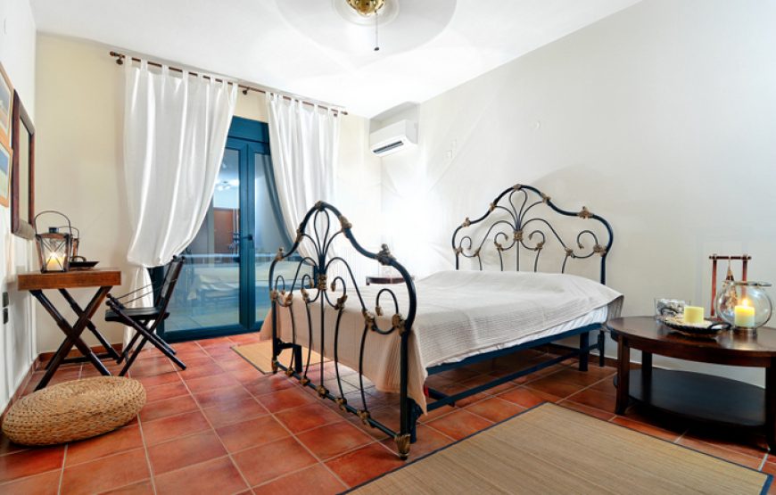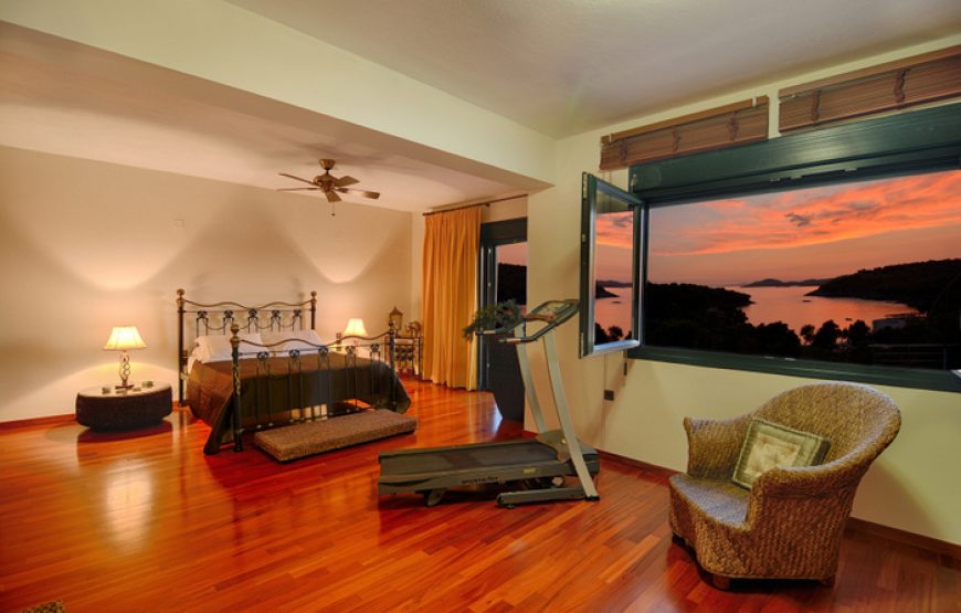 On the second floor the master bedroom, en suite, and next to it a second bedroom with twin beds. Its balcony overlooks Paxos and the south side of Corfu. All rooms of the villa have sea views.