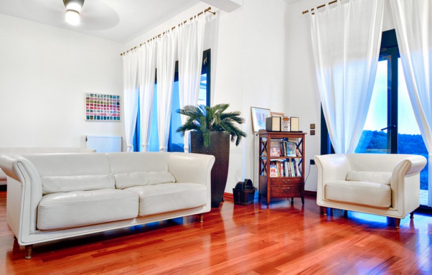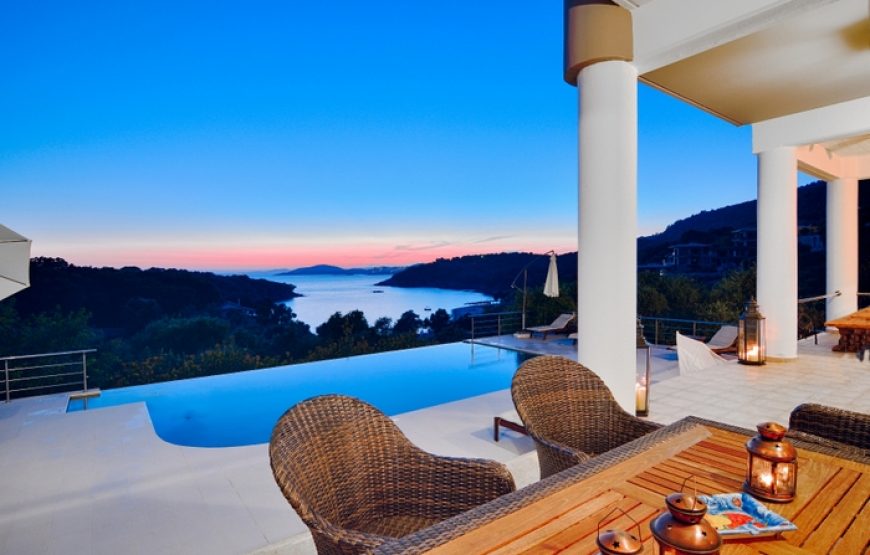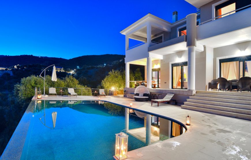 The idea was to design a spacious, luxurious villa in the green landscape that would give guests absolute privacy. It is located in a unique location, offering panoramic views of the Ionian Sea and idyllic sunsets. The estate in which it is located has an area of 7,200 square meters. The gardens are full of plants and fruit trees, giving the visitor a relaxing atmosphere.